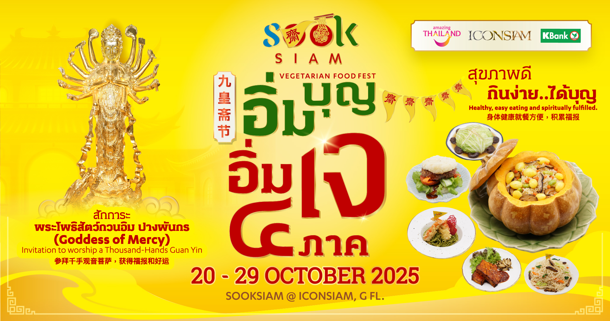 20 ตุลาคม 2568 - 29 ตุลาคม 2568เทศกาลกินเจปีนี้ ชวนมา #อิ่มบุญ...อิ่มเจ กับสารพัดเมนูเจสุดอร่อยจากทั่ว 4 ภาคของไทย ภายใต้คอนเซปต์ “สุขภาพดี กินง่าย ได้บุญ” . อิ่มท้อง อิ่มใจ พร้อมร่วมสักการะ “พระโพธิสัตว์กวนอิม ปางพันกร” ที่อัญเชิญมาประดิษฐาน ณ เมืองสุขสยาม ณ ไอคอนสยาม เพื่อความเป็นสิริมงคล โดยจะมีพิธีสักการะเปิดเทศกาลในวันที่ 20 ตุลาคม 2568 เวลา 16.00 น. . ในงาน “SOOKSIAM อิ่มบุญ อิ่มเจ 4 ภาค” วันที่ 20 – 29 ตุลาคม 2568 เมืองสุขสยาม ณ ไอคอนสยาม ชั้น G . พิเศษ! เมืองสุขสยามร่วมกับผู้ประกอบการจัดกิจกรรม “เปิดโรงเจหม้อใหญ่” แจกอาหารเจวันละ 100 กล่อง ให้กับชุมชนในเขตคลองสาน เติมเต็มทุกความสุขของการกินเจปีนี้… อิ่มท้อง อิ่มใจ สุขภาพดีครบในที่เดียว!