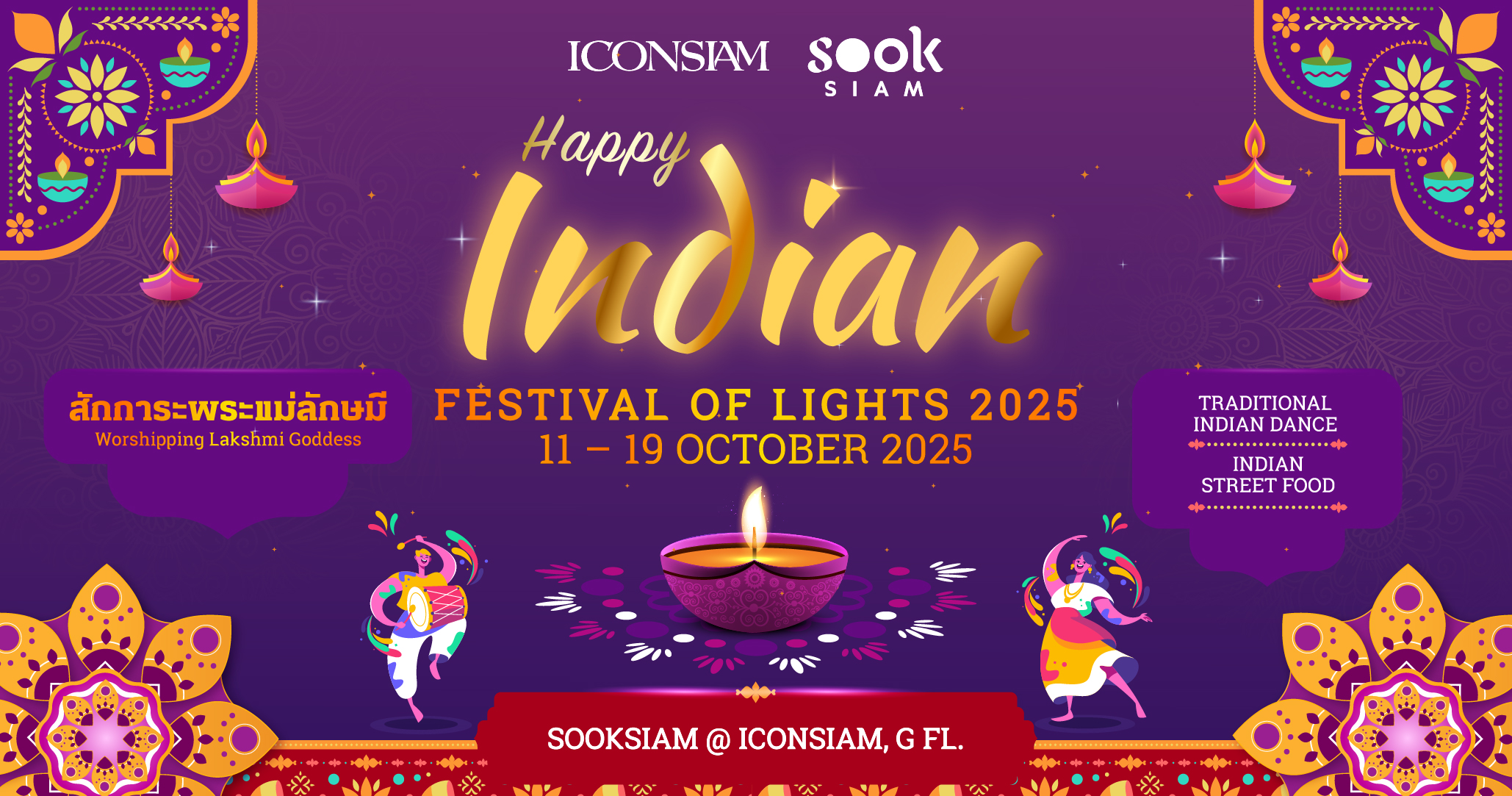 11 ตุลาคม 2568 - 20 ตุลาคม 2568ชวนมาใส่ชุดส่าหรี ไหว้องค์พระแม่ลักษมี ที่อัญเชิญมาจากประเทศอินเดีย เฉลิมฉลองเทศกาลดิวาลี (Diwali) ช่วงเวลาเฉลิมฉลองและเสริมสิริมงคลของชาวอินเดีย สัมผัสสีสัน ความสุข และขอพรเสริมความรุ่งเรือง ได้ที่เมืองสุขสยาม ณ ไอคอนสยาม . พิเศษสุด! ร่วมพิธีสักการะ “พระแม่ลักษมีเทวี” มูรติปางไอศวรรยลักษมีเทวี ปางแห่งความมั่งคั่งและความเจริญรุ่งเรือง เพื่อเสริมสิริมงคล โชคลาภ และความสำเร็จในชีวิต 15 ตุลาคม 2568 เวลา 16.00 น. ประตูสุขสุวรรณศาลา เมืองสุขสยาม ณ ไอคอนสยาม ชั้น G . ดื่มด่ำบรรยากาศแบบอินเดีย ช็อปผ้าส่าหรีและเครื่องประดับสุดงดงาม เพลิดเพลินกับการแสดงวัฒนธรรมไทย - อินเดีย วาดลวดลายเฮนน่า แต่งชุดส่าหรีถ่ายภาพสวย ท่ามกลางบรรยากาศสไตล์อินเดีย . ในงาน "Happy Indian Festival of Lights 2025" 11 – 19 ตุลาคม 2568 เมืองสุขสยาม ณ ไอคอนสยาม ชั้น G . *เวลาอาจมีการเปลี่ยนแปลงหน้างานตามความเหมาะสม *เงื่อนไขเป็นไปตามที่บริษัทกำหนด